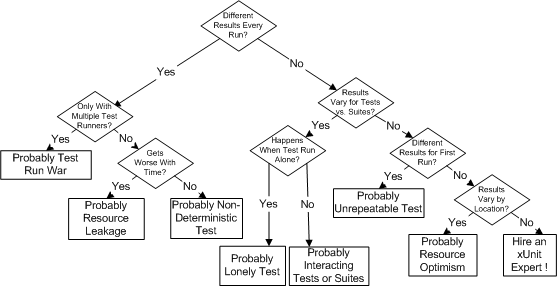 Another possible cause of Nondeterministic Tests is the use of Conditional Test Logic (page X) in our tests. This can result in different code paths being executed on different test runs and that makes our tests non-deterministic. A common "reason" for doing this is the Flexible Test (see Conditional Test Logic). Anything that makes the tests less than completely deterministic is a bad idea!