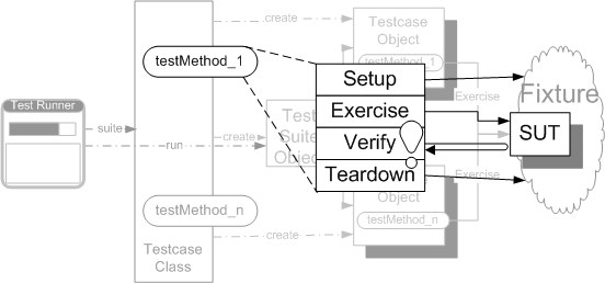 With Testcase Class per Fixture we have a one Testcase Class for each possible test fixture (test precondition) of our SUT class. The Test Methods on that test class exercise various features from the common starting point.