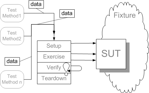 A number of Test Methods each consist of a single call to a Test Utility Method (page X) that includes all parts of the entire Four-Phase Test life-cycle (fixture setup, exercise SUT, result verification and fixture teardown). The Test Methods pass in as parameters any information that the Parameterized Test requires to run and which varies from test to test.