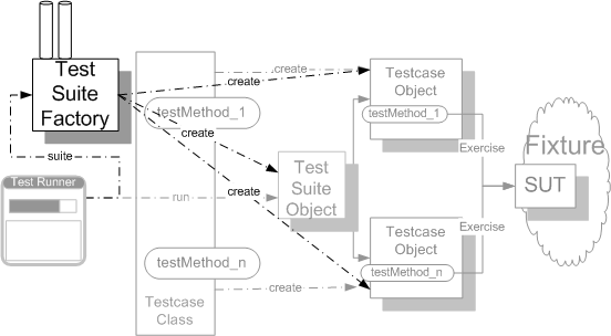 Even in statically-typed languages like Java, the Test Suite Factory (see Test Enumeration on page X) does not need to subclass a specific class or implement a specific interface because the only dependency is on the generic Test Suite Object class it returns and the Testcase Classes or Test Suite Factories it asks for the nested suites.