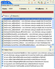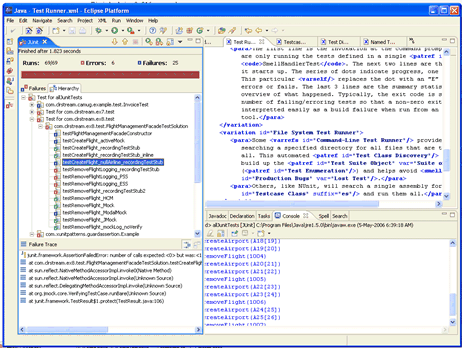 The left pane of the IDE is the JUnit view within Eclipse. The progress bar is at the top of the view, the upper pane is the Test Tree Explorer and the lower pane is the traceback for the currently selected test failure. Note that some Test Suite Objects in the Test Tree Explorer are "open" revealing their contents while others are closed down. The colored annotation next to each Testcase Object shows its status; the annotations for each Test Suite Object indicates whether any contained Testcase Objects failed or errored. The Test Suite Object called "Test for com.clrstream.ex8.test" is a Suite of Suites for the package "com.clrstream.ex8.test"; "Test for allJUnitTests" is the top-most Suite of Suites for running all the tests.