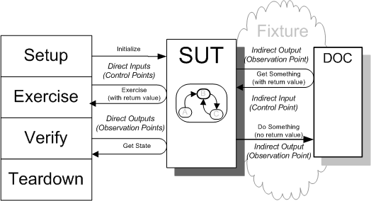 Both control points and observation points can be provided by the SUT as synchronous method calls; we call this "going in the front door." Some interaction points may be via a "back door" to the SUT; we call this Back Door Manipulation. In the diagrams that follow, control points are represented by the arrowheads that point to the SUT whether from the test or from a DOC. Observation points are represented by the arrows whos heads point back to the test itself. These arrows typically start at the SUT or DOC(an asynchronous observation point.) or start at the test and interact with either the SUT or DOC before returning to the test(a synchronous observation point.).