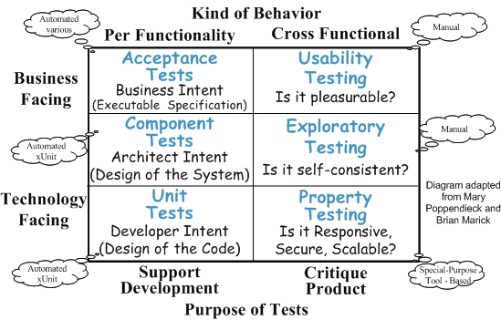 The left column contains the tests we write that describe the functionality of the product at various levels of granularity; we do this to support development. The right column contains tests that span specific chunks of functionality; we execute these tests to critique the product. The bottom of each cell describes what we are trying to communicate or verify.