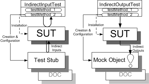 The test on the left controls the SUT's's indirect inputs via a Test Stub while the test on the right verifies its indirect outputs using a Mock Object.