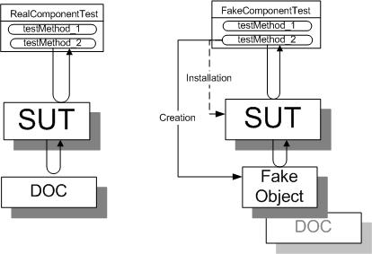 In the figure above, the test on the left is using a Mock Object that is standing in for the DOC as the observation point. The test on the right is using a Test Stub that is standing in for the DOC as a control point. Testing in this style implies a Layered Architecture[DDD,PEAA,WWW] and that opens up the door to using Layer Tests (page X) to test each layer of the architecture independently. An even more general concept is the use of Component Tests (see Layer Test) to test each component within a layer independently.