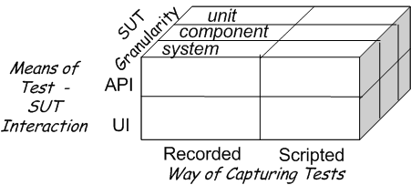 The left side gives us the two ways of interacting with the SUT; the bottom edge enumerates how we create the test scripts; the front-to-back dimension categorizes the different sizes of SUT we may choose to test.