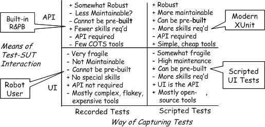 For completeness, the top left quadrant involves creating Recorded Tests via an API somewhere behind the user interface by recording all inputs and responses as the SUT is exercised. It may even involve inserting observations points between the SUT (at whatever granularity we are testing) and any depended-on component (DOC). During test playback, the test APIs are used to inject the inputs recorded earlier and to compare the results with what was recorded