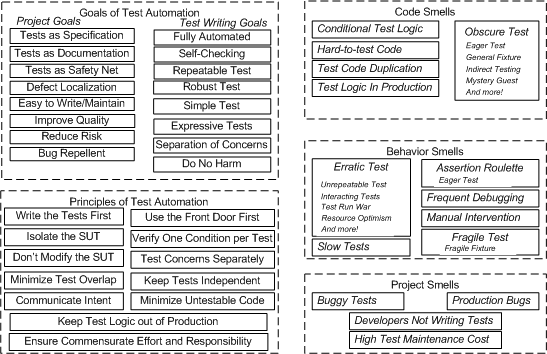 The book is organized in 3 major parts. Part I consists of a series of introductory narratives that describe some aspect of test automation using xUnit. This includes a list of Goals and Principles which are summarized on the left size of this diagram: