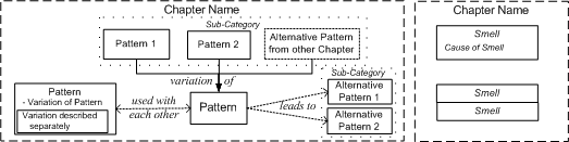 The major boxes in each of the preceding diagrams corresponds to a chapter in the corresponding part of the book; they also correspond the "categories" listed in the top left navigation sidebar on this web site. Selecting a category provides a list of patterns or smells in the category and selecting a specific pattern or smell adds a list of aliases, causes and variations of the chosen pattern or smell.
